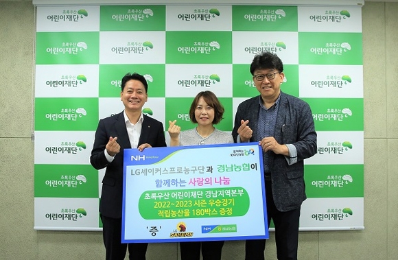 이날 나눔 행사에는 경남농협 김주양 본부장과 LG 세이커스 농구단의 한상욱 단장이 참석해 승리경기에 적립된 농산물 180박스를 초록우산 어린이재단 경남지역본부에 전달했다.