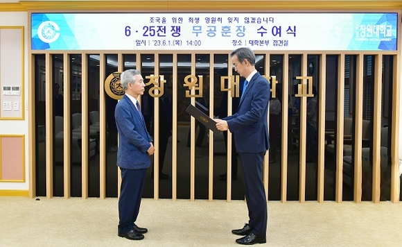이번 화랑무공훈장 전수는 창원대 대학본부에서 이호영 총장과 문자영 R&D혁신본부장이 참석한 가운데 거행됐다.