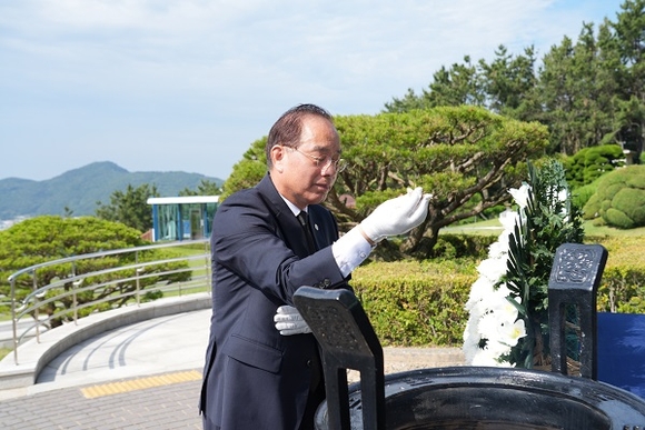 하윤수 부산시교육감이 6일 오전 부산 중앙공원 충혼탑에서 박형준 시장과 안성민 시의장, 국가유공자, 유족 등이 참석한 가운데 열린 '제68회 현충일 추념식'에서 헌화와 분향을 하고 있다. (사진=부산교육청 제공)