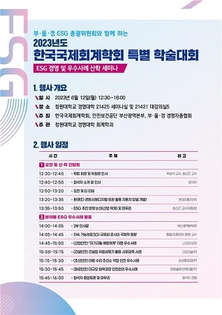 창원대학교는 오는 12일 오후 12시 30분부터 4시까지 경영대학에서 2023년도 한국국제회계학회 특별 학술대회인 'ESG 경영 및 우수사례 산학 세미나'를 개최한다고 7일 밝혔다.