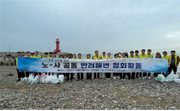 이날 참가자들은 해변정화활동을 시작하기에 앞서 노사공동 해변정화활동의 의미, 반려해변 프로그램의 취지와 환경정화 방법, 안전수칙 교육 등을 받고, 중리해변에 버려진 폐플라스틱, 비닐봉투 등 생활쓰레기와 그물, 쇠파이프 등 어업·산업용 쓰레기 등을 포함해 해양폐기물 182kg을 수거했다.