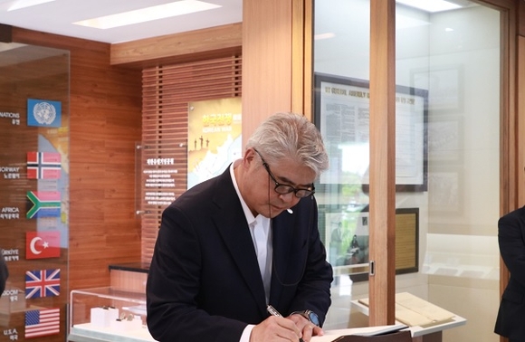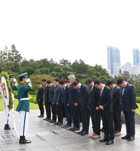 부산항보안공사 임직원들이 ‘호국보훈의 달’을 맞아 8일 남구 대연동 소재의 유엔기념공원을 방문해 6.25 전쟁에 참여·헌신한 전몰용사들에게 헌화 및 추모했다.(사진=부산항보안공사 제공)