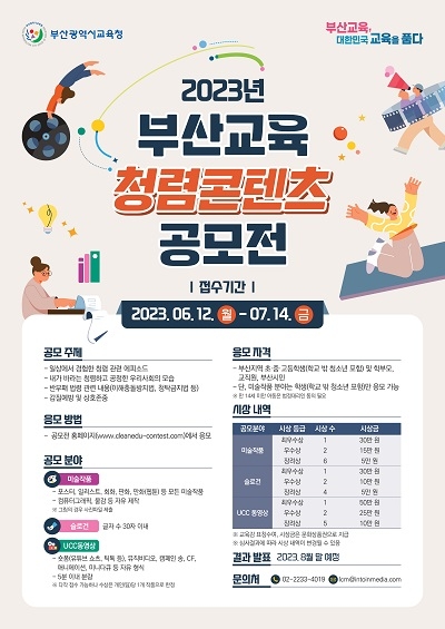부산시교육청이 다음달 14일까지 부산지역 학생, 학부모, 교직원 등을 대상으로 ‘2023년 부산교육 청렴콘텐츠 공모전’을 개최한다고 밝혔다.