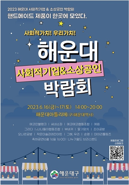 부산 해운대구가 오는 16~17일 아틀리에 칙칙폭폭(옛 해운대역사) 앞 광장에서 사회적경제기업과 소상공인의 판로개척 지원을 위한 ‘사회적경제기업&소상공인 박람회’를 개최한다고 밝혔다.