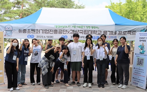 중소벤처기업진흥공단은 경상국립대학교와 협업으로 13일 경상국립대 가좌캠퍼스에서 중진공X경상국립대 용기내! 캠페인을 한 후 참석자들이 기념촬영을 하고 있다. (사진=중진공 제공)