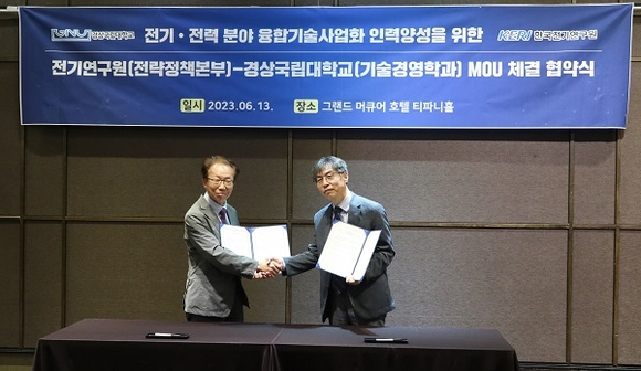 경상국립대학교 대학원 기술경영학과(MOT)와 한국전기연구원 전략정책본부는 지난 13일 창원 그랜드머큐어 앰버서더 호텔에서 전기·전력 분야 융합형 기술경영인재 양성과 산·학·연 지역혁신체제 구축을 위한 업무협약을 체결했다.