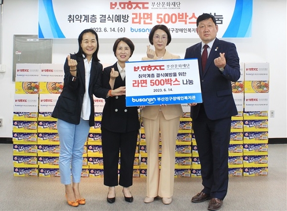 부산문화재단이 14일 부산진구장애인복지관에 지역 취약계층 결식예방 지원을 위한 나눔 활동의 일환으로 라면 500박스를 전달했다고 밝혔다. 부산문화재단 이미연 대표이사는 “문화예술 창작활동 지원과 향유 기회 확산 등을 위한 노력과 함께 지역 소외계층 대상을 발굴하고 지자체 출연기관으로서 사회적 책임을 이행할 수 있는 다양한 사회공헌과 ESG 경영 활동을 펼칠 수 있도록 노력하겠다”고 전했다.