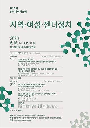 부산대학교 여성연구소와 계명대학교 여성학연구소 인문사회연구사업단 공동주관으로 '제10회 영남여성학포럼'이 16일 오후 1시 30분부터 부산대 인덕관 대회의실에서 개최된다.