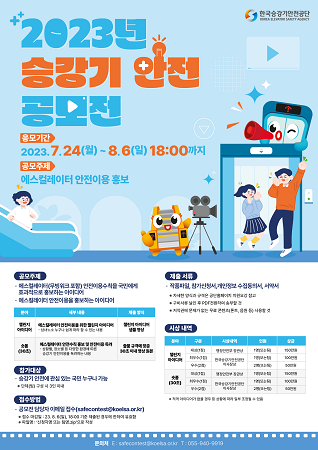 한국승강기안전공단(KoELSA)가 '에스컬레이터 안전하게 이용하기'를 주제로 2023년 승강기 안전 공모전을 개최한다고 15일 밝혔다.