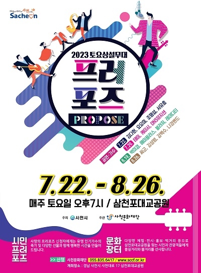 경남 사천의 대표적인 여름축제인 '2023 토요상설무대 프러포즈'가 삼천포대교공원 해상무대에서 화려하게 펼쳐진다.