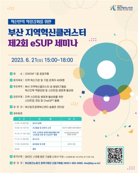 부산 국가혁신융복합단지추진단(부산테크노파크 정책기획단)이 오는 21일 오후 3시 CENTAP 창업카페에서 지역 해양ICT융합 혁신인력의 역량강화 및 스타트업 생태계 활성화를 위한 ‘부산 지역혁신클러스터 제2회 eSUP(Empowerment Scale-UP) 세미나’를 개최한다고 밝혔다.