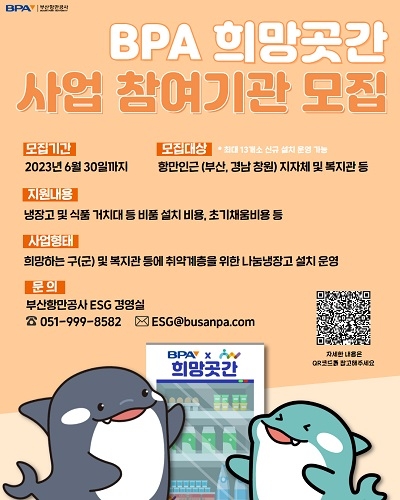 BPA는 지역사회가 스스로 어려운 이웃을 돌보는 나눔문화 활성화를 위해 ‘BPA 희망곳간’을 항만 인근 지역 중심으로 최대 20개소까지 확대할 계획이다. 이를 위해 지자체 행정복지센터 또는 사회복지관을 대상으로 BPA 희망곳간 운영기관을 모집한다.