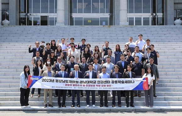 경남대학교 인권센터는 16일 본관 국제세미나실에서 경남도경찰청과 함께 공동학술세미나를 개최한 후 단체 기념촬영을 했다. (사진=경남대 제공)