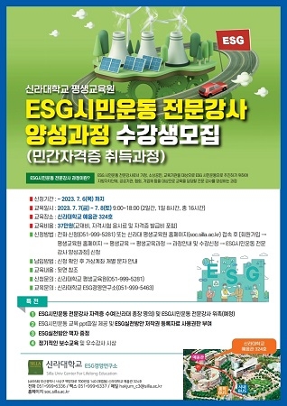 신라대학교는 ESG시민운동 전문강사 양성과정 수강생을 모집한다고 19일 밝혔다.