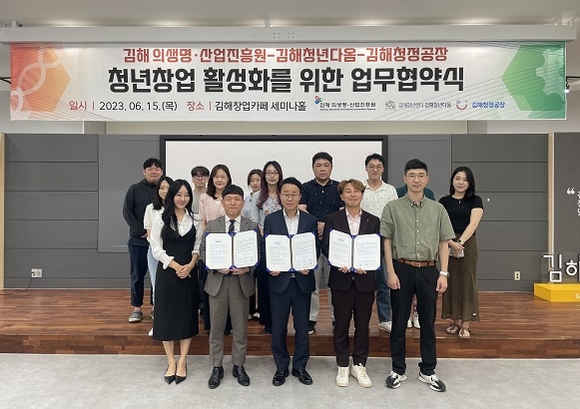 김해의생명산업진흥원은 지난 15일 김해창업카페 세미나홀에서 관내 청년창업 활성화를 위해 김해청년다옴, 김해청정공장과 3자간 업무협약을 체결했다.