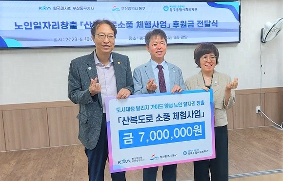 한국마사회 부산동구지사는 지난 15일 부산시 동구 '도시재생마을 산복도로 빌리지 가이드 노인 일자리창출 사업' 후원금으로 700만 원을 부산 동구종합사회복지관에 전달했다고 밝혔다.