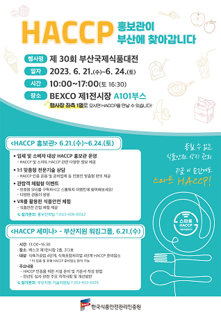 한국식품안전관리인증원(HACCP인증원)은 21일부터 24일까지 4일간 부산 벡스코에서 개최되는 '제30회 부산국제식품대전'에서 스마트 HACCP 홍보관과 HACCP 워킹그룹을 운영한다.