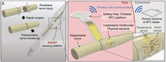 배터리 없는 무선 장치 구성은 전체 시스템을 가볍고 간단하게 하며, 자유로운 움직임을 방해하지 않고 완전히 이식 가능하게 할 수 있다. 손상된 신경에 대한 지속적인 체내 온도와 변형 측정은 센서 시스템의 유효성, 생체적합성, 안정성을 입증한다.