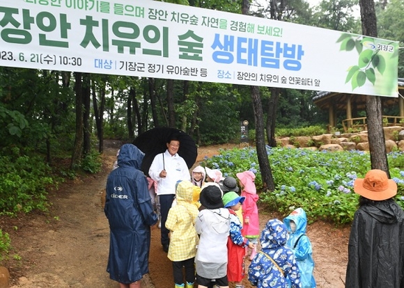 부산 기장군이 21일 장안읍 명례리 일원에 위치한 ‘장안 치유의 숲’에서 관내 유아를 대상으로 ‘숲 해설과 함께하는 생태탐방 프로그램’ 시범운영 행사를 열었다고 밝혔다.