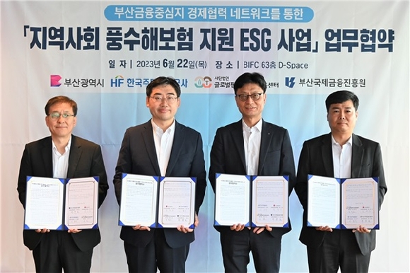 한국주택금융공사(HF)가 부산시·글로벌핀테크산업진흥센터·부산국제금융진흥원과 ESG경영 실천을 위한 ‘지역사회 풍수해보험 지원 ESG 사업’에 관한 협약을 체결했다고 22일 밝혔다.