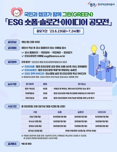 한국자산관리공사(캠코)가 오는 23일부터 다음달 24일까지 ‘국민과 함께 그린(Green) ESG 숏폼·슬로건·정책 아이디어 공모전’을 개최한다고 밝혔다.