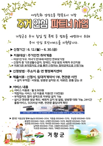 경남 거창군은 1인 가구를 대상으로 한 범죄 예방을 위해 민간보안업체와 협약을 맺고 주거안심 파트너 사업을 본격 추진한다고 22일 밝혔다.