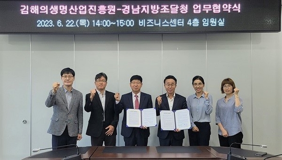 김해의생명산업진흥원은 22일 김해중소기업비즈니스센터 4층 임원실에서 경남지방조달청과 업무협약을 체결했다.