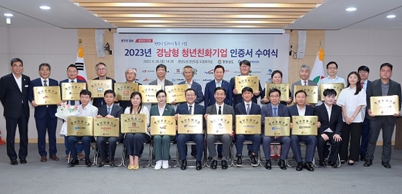 경남도는 26일 오후 도정회의실에서 '2023년 경남형 청년친화기업'으로 선정된 20개 기업에 인증서를 수여했다.