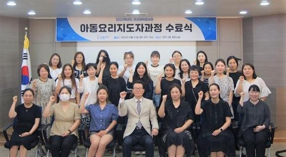 한국폴리텍대학 동부산캠퍼스는 27일 여성재취업 아동요리지도자과정 수료식을 한 후 단체 기념촬영을 했다. (사진=동부산 폴리텍 제공)