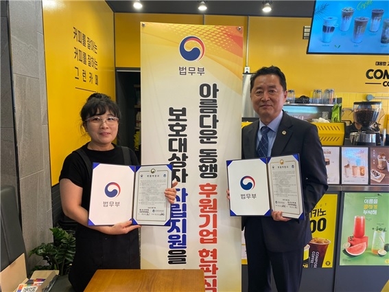 한국법무보호복지공단 부산지부가 28일 경남 김해소재의 ‘컴포즈커피 주촌무지개공원점’을 방문해 대표 및 업체 관계자들이 참석한 가운데 아름다운 동행 ‘THE 안전한 대한민국’ 후원기업 42호 현판식을 개최했다고 밝혔다.