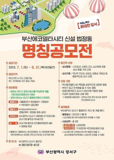 부산 강서구가 부산시민을 대상으로 에코델타시티 내 신설 법정동 설치를 위한 동 명칭을 공모한다.