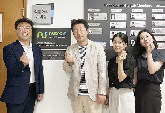 조승목 뉴트라잇 대표와 송진호 마그나인베스트먼트 부사장 등이 부경대 연구실 앞에서 기념촬영하고 있다. (사진=부경대 제공)