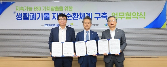한국토지주택공사(LH)는 30일 전국 보상현장에서 발생되는 생활폐기물로 인한 환경오염, 처리비용 등 문제 해결을 위해 한국환경공단, E-순환거버넌스와 '생활폐기물 자원순환체계 구축을 위한 업무협약'을 체결했다.