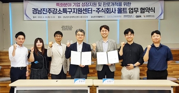 경남진주강소특구지원센터는 지난 29일 경남창조경제혁신센터 4층 포도방에서 올트와 특화분야 기업 성장지원 및 판로개척을 위한 업무협약을 체결했다.