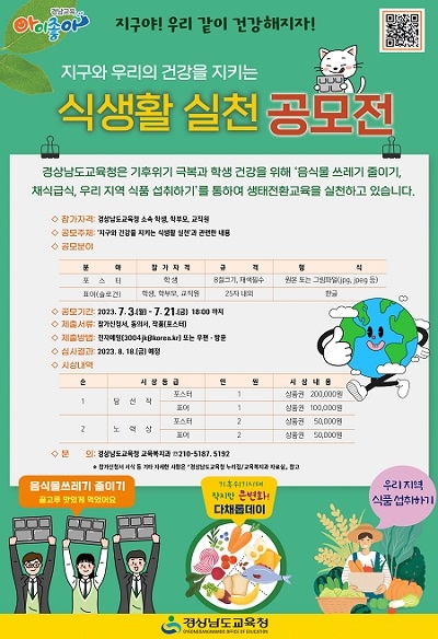 경남도교육청이 학생, 학부모, 교직원을 대상으로 '지구와 건강을 지키는 식생활 실천 공모전'을 3일부터 오는 21일까지 진행한다.