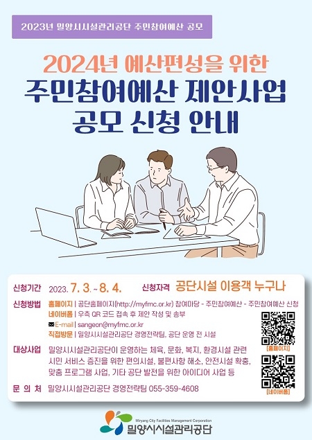 밀양시시설관리공단은 2024년 주민참여예산 편성을 위한 제안사업 공모를 8월 4일까지 실시한다고 3일 밝혔다.