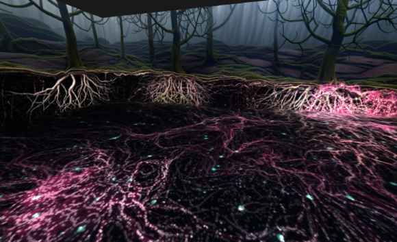 작품 ‘얽힘’은 지하루 작가가 지속해온 인공자연 작품의 연작으로, 어텐션 메커니즘(Attention Mechanism : 인공지능 분야에서 사용되는 기술 중의 하나로 입력의 특정 부분에 더 많은 중요성을 부여하는데 사용되는 기제)을 사용해 식물들의 뿌리 사이를 연결하는 균류 또는 두뇌 속의 신경망의 연결, 소통 및 성장 기제의 작동을 구현한 작품이다.