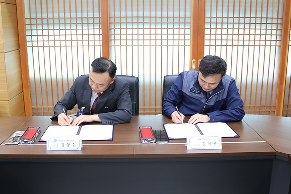 4일 KAI 문희찬 안전실장(우측)과 공군 항안단 강봉수 단장이 협약서에 서명을 하고 있다.(사진=KAI 제공)