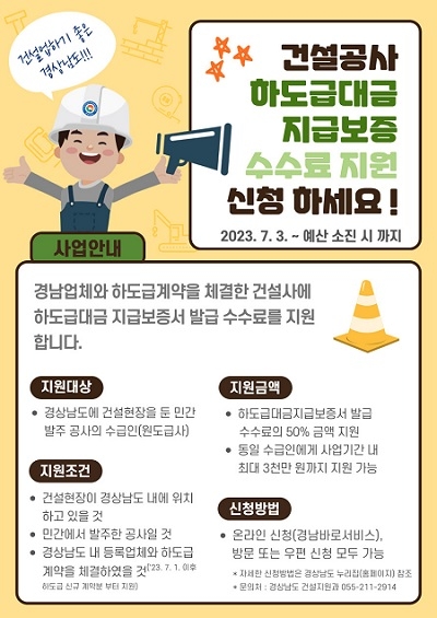 이 사업은 경남도가 전국 최초로 시행하는 사업으로, 지역 건설업체에 하도급을 주는 원도급 건설사에 건설공사 하도급대금 지급보증서 발급에 소요되는 수수료의 50%를 지원하며, 업체당 최대 3천만 원까지 지원한다.