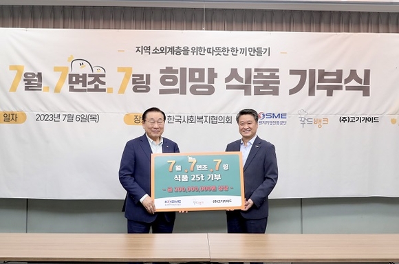 중소벤처기업진흥공단(이하 중진공)은 창업정책지원을 통해 성장한 고기가이드, 한국사회복지협의회의 위탁사업 수행기관인 전국푸드뱅크(이하 푸드뱅크)와 함께 6일 지역 취약계층 식품 지원을 위한 '7.7.7(칠월,칠면조,칠링) 희망식품 기부식'을 개최했다고 밝혔다.