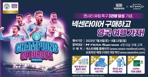 넥센타이어가 공식 파트너사 맨체스터 시티(맨시티)의 2022/23 시즌 유럽 축구 3관왕 달성을 기념하며 구매 고객 대상 이벤트를 실시한다고 7일 밝혔다.
