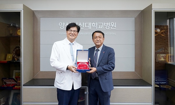 양산부산대병원은 '급여제한여부조회제도'에 대한 적극적인 협조로 건강보험 가입자의 정당한 수급권 보호에 기여해 지난 5일 국민건강보험 양산지사장이 양산부산대병원에 방문해 이상돈 병원장에게 감사패를 전달했다.