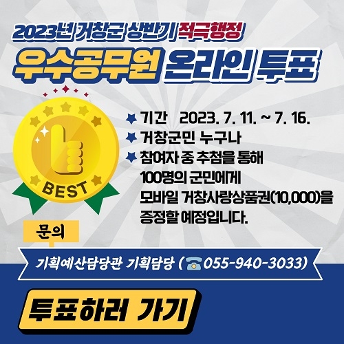 경남 거창군이 오는 16일까지 '2023년 상반기 적극행정 우수공무원 선정'을 위해 군청 홈페이지에서 군민대상 온라인 투표를 진행한다.