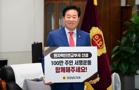 김진부 경남도의회 의장은 지난 11일 원자력안전교부세 신설을 촉구하는 '100만 주민 서명운동' 홍보 챌린지에 동참했다. 이번 챌린지 참가는 안성민 부산시의회 의장의 지목에 따라 이루어졌다.