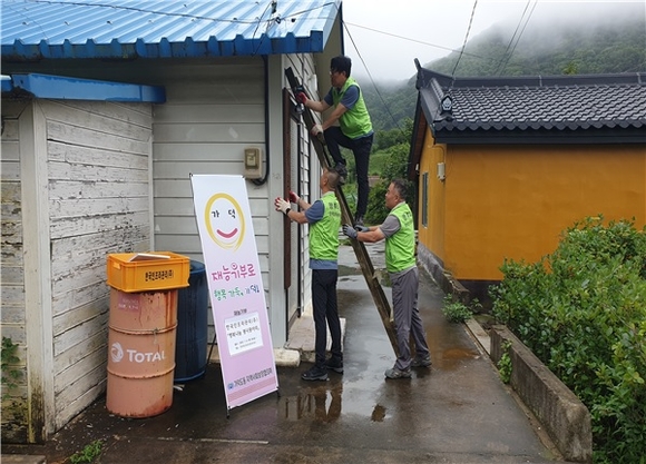 부산 강서구 가덕도동 내 경로당의 현판을 정비하고 있다.(사진=강서구 제공)