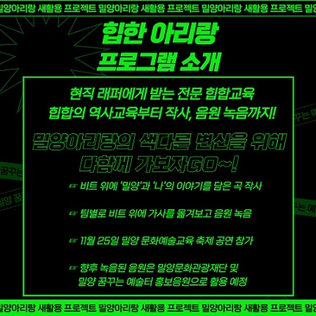 교육 내용은 현장에서 활동하는 래퍼와 함께 '나'와 '밀양'의 이야기를 담은 작사 교육 및 랩 교육이다. 재단에서 자체 제작하는 음원에 참여해 수강생이 자연스럽게 전통 계승의 중요성을 깨닫고 변화를 몸으로 느끼면서 결과물을 만들어간다.