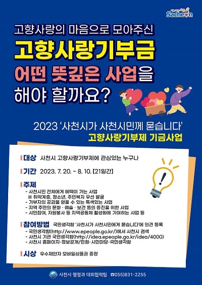 경남 사천시는 고향사랑의 마음으로 모아진 사천시 고향사랑기금을 활용한 기금사업 발굴을 위해 오는 20일부터 8월 10일까지 시민들의 참신한 의견을 수렴한다고 밝혔다.