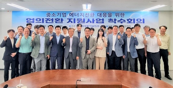 참석자들이 20일 서울 발전공기업협력본부에서 개최한 '업의 전환 지원사업 착수회의'에서 단체 기념촬영을 했다. (사진=동서발전 제공)