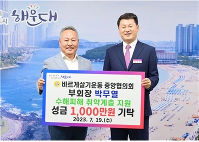 바르게살기운동중앙협의회가 해운대구에 최근 계속된 폭우로 피해를 입은 취약계층 독거노인을 위해 써달라며 1000만원을 지난 19일 기탁했다.