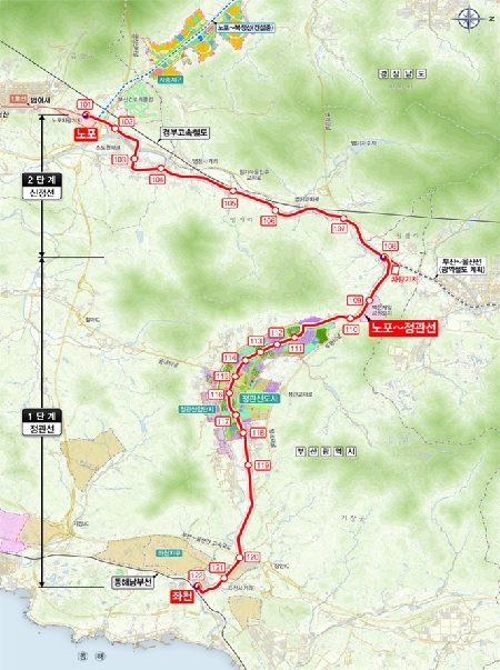 도시철도사업(노포정관선)의 1단계(정관지역) 구간은 동해선 좌천역에서 시작하고 정관신도시를 경유해 월평역에 이르는 약 13km 구간이다. 노면전차(Tram)와 15개의 지상정거장이 설치되며 총사업비는 약 3439억으로 사업기간은 2023년부터 2029년까지로 계획하고 있다.